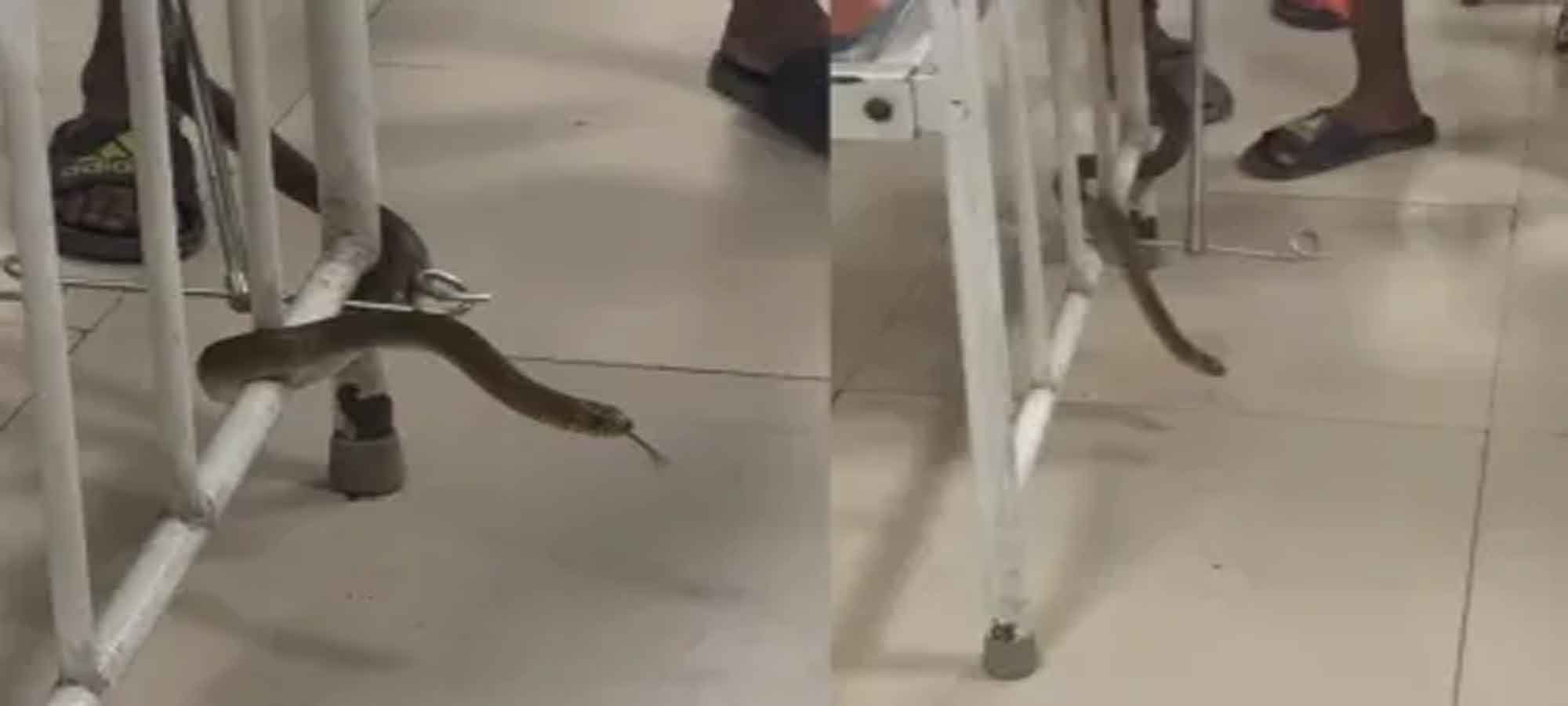 घटना अस्पताल के महिला वार्ड की बताई जा रही है। वीडियो में साफ दिखाई देता है कि एक महिला मरीज अपने बेड पर आराम कर रही थी, तभी उसके बिस्तर पर एक सांप—जो देखने में किंग कोबरा जैसा लग रहा था—रेंगता हुआ आया। सांप को देखते ही मरीज घबरा गई और चीख पड़ी। उसके बाद वार्ड में मौजूद अन्य मरीज और स्टाफ तुरंत हरकत में आ गए। माहौल कुछ ही क्षणों में तनावपूर्ण हो गया और कई लोग डरकर अपनी जगहों से दूर हट गए।